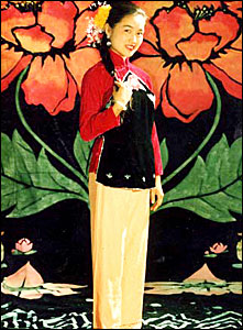 服飾 回族の人たちの服飾は簡潔である。男子は頂の丸い形の平らかな白い帽子をかぶり、白いシャツに黒いチョッキを著ているが、女子は頭巾か白い帽子をかぶり、よく裝身具を身に著けている。