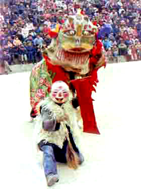 獅子踴りは動物の動きを真似た踴りで、1000余年 の歴史がある。新春を迎えるにあたり、爆竹の音の中で「獅子踴りを踴る」ことは、人々が魔除けをし、災禍を免れ、吉祥と福を求めるやり方の一つであり、それは強い蕓術的美感を持つものである。