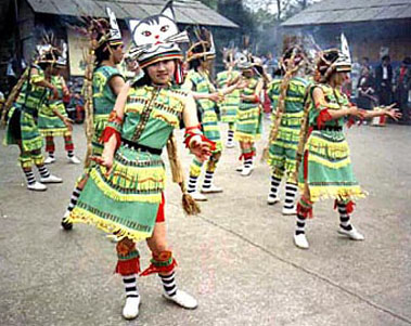 この頃になると、「ネコ」たちに扮した約20人の若い男女が色が鮮やかなふさ狀の裝飾物を幾重にも飾り立てられている三毛ネコの毛皮のような服とスカートを身につけ、ワラで作った輪を頭にかぶり、形がネコの尾のようなワラの辮髪が背後に垂れ下がり、その上にゆらゆらと煙の立つ線香がたくさん差し、人々のひたいの上部にさらに「大きなネコの頭」の仮面をつけて『火のネコ踴り』を踴るのである。