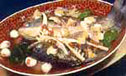 3、魚のスープをこして、ハマグリのスープを煮沸させ、マツタケ、熟したハムの切れを入れ、よく調節してから汁の入ったドンブリの中に入れて出來上がりとなる。