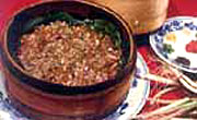 材料 きれいに洗った牛肉250グラム 炒めたビーフン40グラム 野菜の葉100グラム ネギのみじん切り、ショウガの粉それぞれ3グラム 甘みそ50グラム 郫県のドウバンジャン10グラム