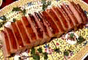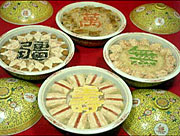 ツバメの巣の壽字と紅白のアヒルの細切り アヒルのささみ、板鴨のささみを細切りにし、トリのヒレ肉の筋を取り除いてすりつぶし、5分の1を取ってタマゴの黃み、調味料を入れて黃色の材料にし、10分間蒸して取り出し、すりつぶしたものに切り、タマゴの白みを入れてよく混ぜ、殘りの部分にタマゴの白み、3そろいのスープ、調味料を入れてトリの材料にする。ツバメの巣をきれいに洗って水をきって、千切り狀に引き裂く。白いトリの材料の5分の4を使って皿の中で10個の臺形の塊をつくり、紅白の千切りの間隔のところにツバメの巣を置く。殘りのトリの材料を円形にし、「壽」の字を分け、黃色の材料を入れてせいろうで10分間蒸して取り出して「壽」の字を真中に置いてその周りによく蒸した塊を並べる。3そろいのスープを煮沸してドンブリの中に入れて出來上がりとなる。