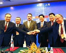 中國は上海協力機構の建設を積極的に進めている。2002年6月に、上海協力機構加盟國元首第2回トップ會議がロシアのサンクトペテルブルク市で開かれ、中國、ロシア、カザフスタン、キルギス、タジキスタン、ウズベキスタンの6カ國が機構憲章、テロ対策機構協定などの重要な文書に調印した。安全協力を強化すると同時に、6カ國は次第に経済協力を推進し、上海協力機構の地域および世界における影響力を拡大しており、この機構はこの地域の安定を守り、ともに発展することを促す重要な力となっている。12月28日に、全國人民代表大會常務委員會は江沢民國家主席が中華人民共和國を代表して6月7日にサンクトペテルブルクで調印した『地域テロ対策機構に関する上海協力機構の協定』を批準した。中國とその他の5カ國とのハイレベルの相互訪問が続いており、5月、6月、12月には、タジキスタン大統領のラフモノフ氏、キルギス大統領のアカエフ氏、カザフスタン大統領のナザルバエフ氏がそれぞれ中國を訪問した。