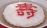 4、タマゴの白みをノリ?duì)瞍摔贰⒂亭颏蓼证筏看螭拭螭巳毪臁⒅睆?5センチ、厚さ1センチの円形をつくり、上はハムの拍子切りで「壽」の字をつくって2分間ほど蒸してから取り出す。