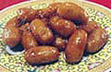 4、油の入ったナベが熱くなると、白砂糖を入れてこがね色になるまで揚(yáng)げ、赤いナツメをさっと入れ、ナベを上下に動(dòng)かしてムラがないようにして、油をまぶした皿の中に入れて出來(lái)上がりとなる。