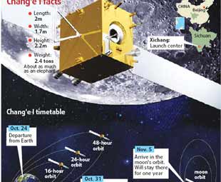 China's first lunar satellite blasts off on Oct 24. The satellite, named "Chang'e" after the legendary Chinese goddess, will orbit the moon for a year.