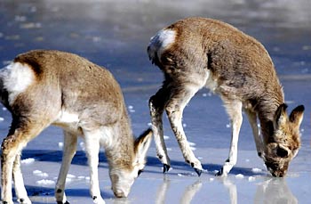 En el Centro de Primeros Auxilios de Antílopes Tibetanos de Hoh Xil, el macho originario Yuanxiang (primero a la izq.) y la hembra originaria Yuanyan buscan alimento en un río congelado