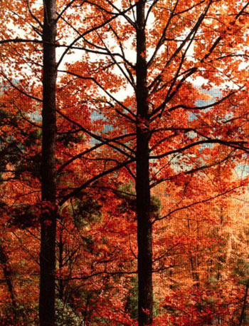 A la brisa fresca, las primeras escarchas del oto?o han vuelto las hojas de los fustetes amarillos tan rojas como los celajes que surcan el firmamento. Una veintena de variedades de árboles de follaje rojo, tales como el arce rojo de Estados Unidos, el fustete rojo de Holanda, el ciruelo y el bruno de follaje violeta, ti?en de rojo y tornan atractivas la monta?a Baiwang, las laderas de monta?a en Hongluosi y las de junto al valle Mutianyu y al lago Jinhai, situadas en los arrabales de Beijing.