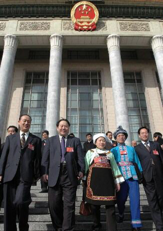 El día 14 se clausuró la III Sesión de la X Asamblea Popular Nacional en el Gran Palacio del Pueblo en Beijing. En la foto, diputados saliendo del salón de reuniones.