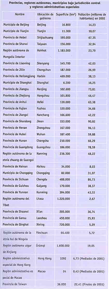 Los municipios bajo jurisdicción central y los municipios relativamente grandes se subdividen en distritos urbanos y suburbanos. Las prefecturas autónomas se subdividen en distritos, distritos autónomos y municipios. Las regiones autónomas, las prefecturas autónomas y los distritos autónomos son lugares de minorías étnicas que disfrutan de autonomía. Conforme a la Constitución, si ello fuera necesario, el Estado puede establecer regiones administrativas especiales, subordinadas directamente al Gobierno Central.