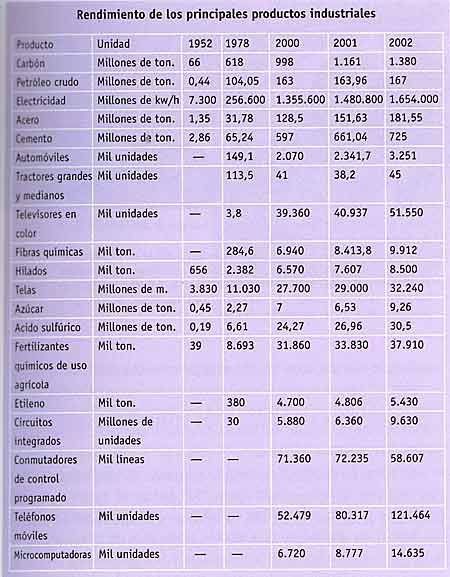 Gracias a ese rápido desarrollo, la producción de los principales rubros industriales se ha multiplicado por varias decenas e incluso por varios centenares de veces. Muchos productos industriales chinos se venden en diversos países y regiones. A partir de 1996, la producción de acero, carbón, cemento, fertilizantes químicos agrícolas y televisores se situó en el primer lugar a nivel mundial.