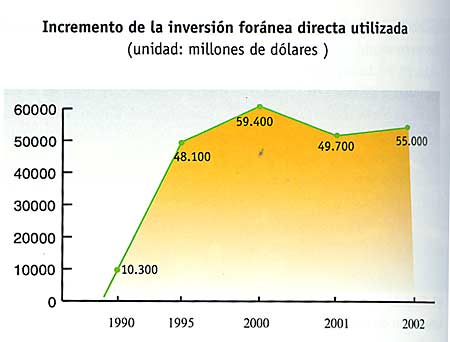 En 2002, China usó 55.000 millones de dólares, 52.700 millones de ellos inversiones directas, convirtiéndose por primera vez en el país receptor de mayor cantidad de fondos extranjeros en todo el mundo. La Comisión Estatal de Desarrollo y Reforma considera que el hecho de que, en circunstancias en que la economía mundial no se encuentra en un estado de prosperidad y en que se reducen en gran medida las inversiones internacionales, China haya podido lograr tan destacados resultados en el aprovechamiento de fondos foráneos, se debe sobre todo a que ha cumplido a conciencia las promesas ante la OMC, por ejemplo la rebaja de los tipos arancelarios, la apertura de las limitaciones a la inversión y financiación foráneas, la ampliación de la apertura, así como la revisión, modificación y mejoramiento de las leyes y reglamentos referentes al exterior, a gran escala.