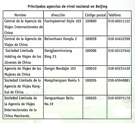 En los últimos a?os, China ha progresado mucho en sus instalaciones y servicios de turismo. Cada a?o, la Administración Estatal del Turismo premia a las agencias de viajes calificadas y estimula a las entidades del turismo a ofrecer mejores servicios a los clientes. Actualmente operan más de 1.300 agencias de viajes internacionales, 250 de ellas en los cuatro municipios bajo jurisdicción central, Beijing, Shanghai, Tianjin y Chongqing.
