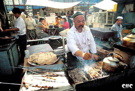 Puesto de venta de carne asada en Karamay