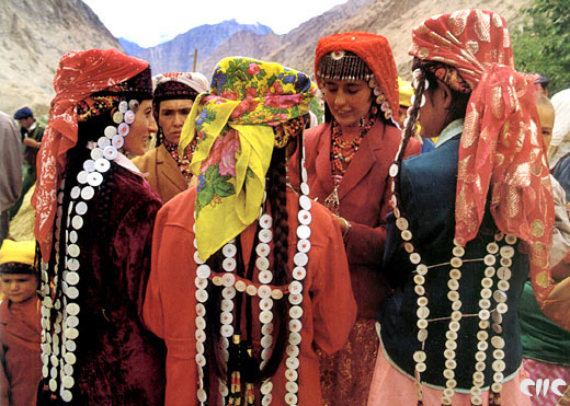 Adornos de cabello de una muchacha tajika en Taxkorgan